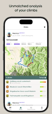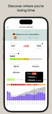 Men Climbfinder är inte bara ett verktyg för upptäckt. När du väl har tacklat en stigning, förvandlas den till en kraftfull plattform för självförbättring. Climbfinder markerar automatiskt alla klättringar du har avverkat och erbjuder en enastående djupgående analys av dina prestationer. Få exakta insikter om var du vinner eller förlorar tid på specifika segment, och identifiera de kritiska punkterna där du kan optimera din ansträngning för att nå din fulla potential. Climbfinder beräknar även din potentiella prestationstid för varje europeisk cykelklättring med anmärkningsvärd precision, vilket ger dig ett tydligt mål att sträva efter. Dela dina egna upplevelser och bli en del av en växande gemenskap, där passion för klättring förenar cyklister.