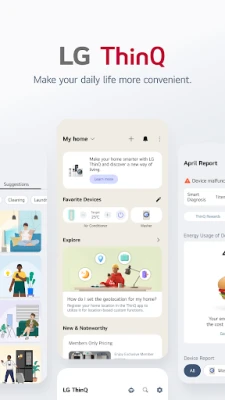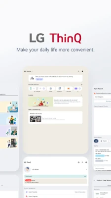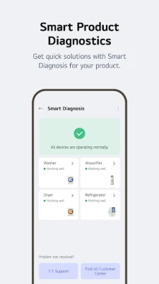 Oroa dig mindre och njut mer av dina produkter med LG ThinQs omfattande supportfunktioner. Få snabb hjälp med inbyggd smart diagnostik som kontrollerar enhetens status och vägleder dig genom potentiella problem. Behöver du professionell hjälp? Boka enkelt ett servicebesök direkt via appen. För omedelbara svar på dina frågor finns den AI-drivna funktionen "Chatta med LG", som ger skräddarsydda råd baserade på din produkts specifika situation. LG ThinQ är din kompletta partner för ett problemfritt, energieffektivt och smart uppkopplat hem.