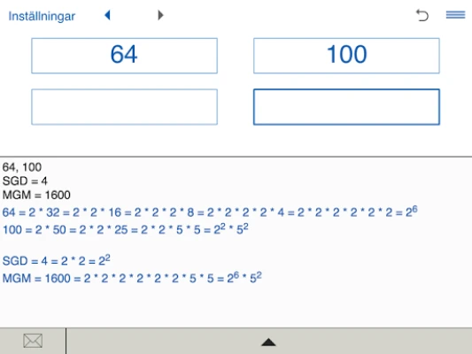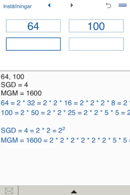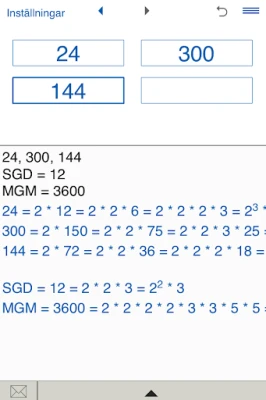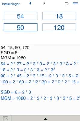 Kärnan i appens funktionalitet ligger i dess förmåga att snabbt och tillförlitligt hantera heltal i grupper om två, tre eller till och med fyra. Den unika metoden med primtalsfaktorisering säkerställer inte bara korrekta resultat varje gång, utan ger också en djupare insikt i talens struktur – ett pedagogiskt värde i sig. Denna avancerade beräkningsmotor arbetar noggrant för att bryta ner varje tal, vilket garanterar att de SGD och MGN som presenteras är exakta och lätta att förstå.
